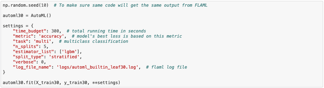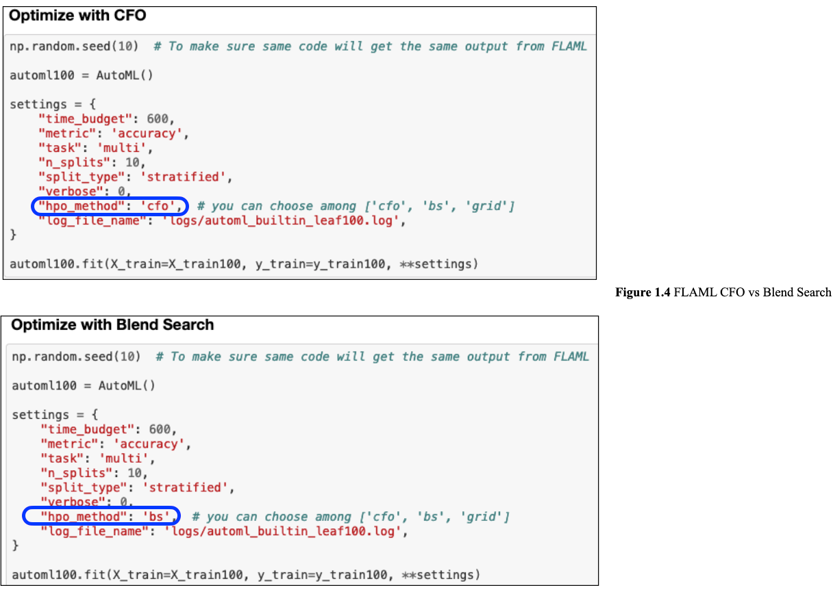 To use CFO or Blend Search in FLAML, users only need to specify the hpo_method in their settings like what you are seeing in Figure 1.4. What's more, in the settings below, it doesn't specify estimator_list as the experiment for Leaves30 above, so FLAML will use its default learner list which contains LGBM, XGBoost, Random Forest, Catboost, etc.