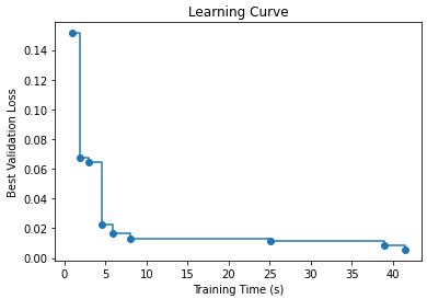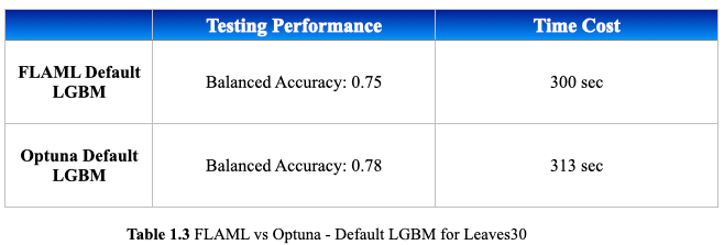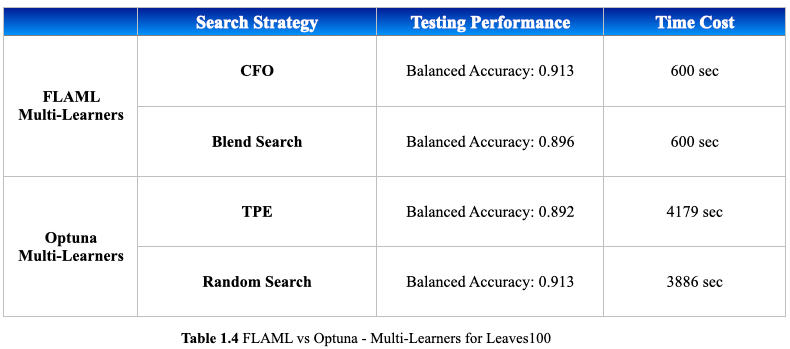 The performance difference on the Leaves100 dataset is more pronounced. While both methods achieved similar balanced accuracy on the testing data, FLAML took only 10 minutes, whereas Optuna took over an hour, despite FLAML tested on more learners. Additionally, FLAML's CFO outperformed Blend Search in terms of the testing performance, which is expected since the search space in this experiment was not very large due to the use of default settings. According to FLAML researchers, CFO is chosen as the default search strategy because it often performs better than Blend Search in many practical scenarios.