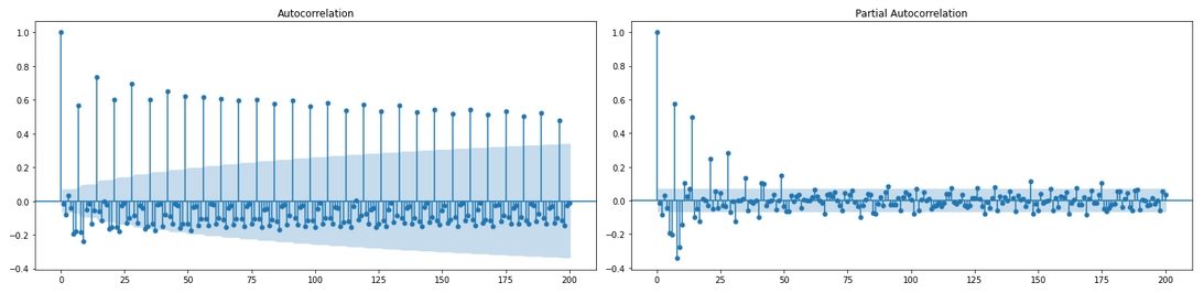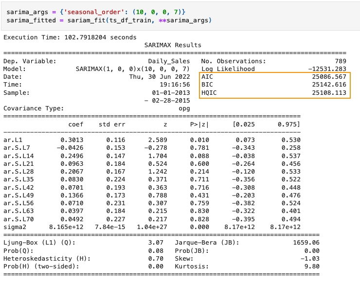 Now let's add m=7 in SARIMA while using (p=10, d=0, q=0) as an example. Note, using p=10 is not conflict with what we just found that p=7 is more ideal, this is just an example, check "Step 3" below for more.