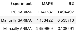 Here's the forecasting performance comparison between manually assigned ARIMA, manually assigned SARIMA and HPO tuned SARIMA.