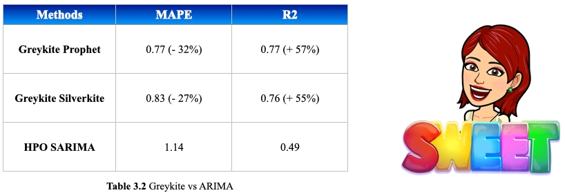 Letโs return to our trusty companion, Greykite. As shown in Table 3.2, compared to the best result from ARIMA, both of Greykite's templates have achieved improvements in both MAPE and R2. How exciting! Now, letโs dive deeper into Greykite forecasting!