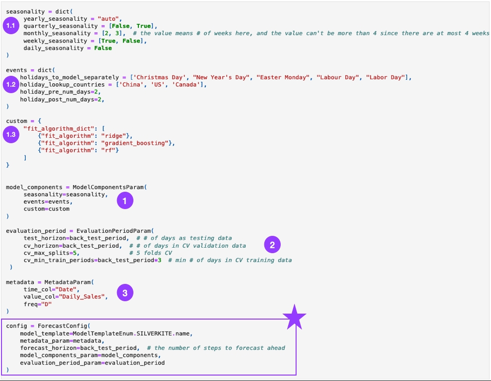 ModelComponentsParamis where you can config feature generation and model settings.seasonalityallows you to specify seasonality features.eventsis where to specify special events features.holidays_to_model_separatelyis to tell Silverkite to use specified holidays independently, and the rest of the holidays will be used together as 1 event.customis where to config models' settings.