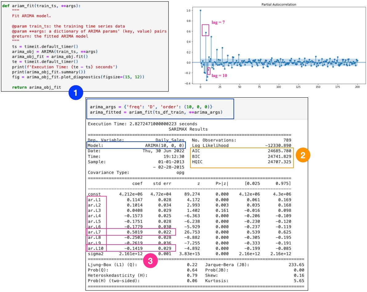 p=7might get a better performance than usingp=10, as PACF shows the highest autocorrelation appears at lag 7 and the fitted ARIMA model shows the highest absolute coefficient and the lowest standard error