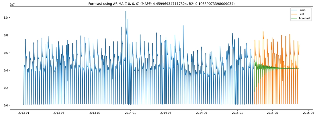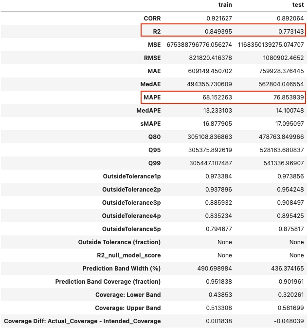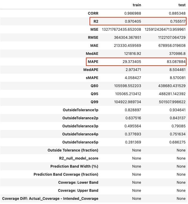 Besides the plot, Greykite also output a list of evaluation metrics during the training and testing stage. To compare with ARIMA best results, we only look at R2 and MAPE here. Note that, we need to divide Greykite's MAPE by 100 in order to compare with sklearn MAPE.