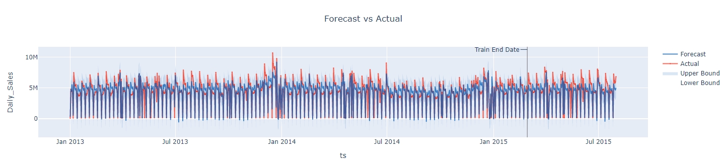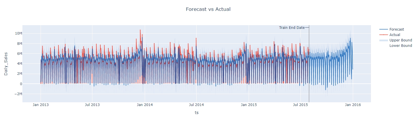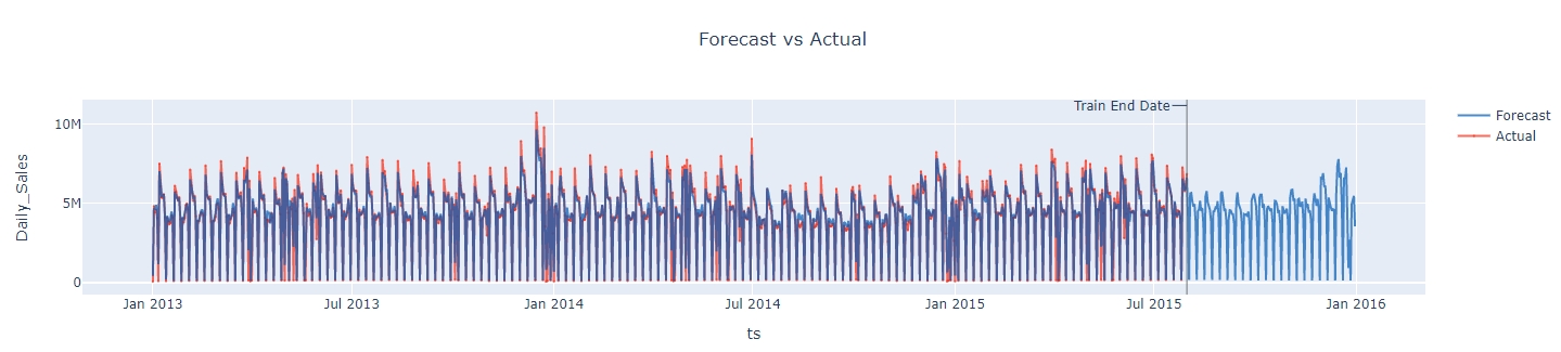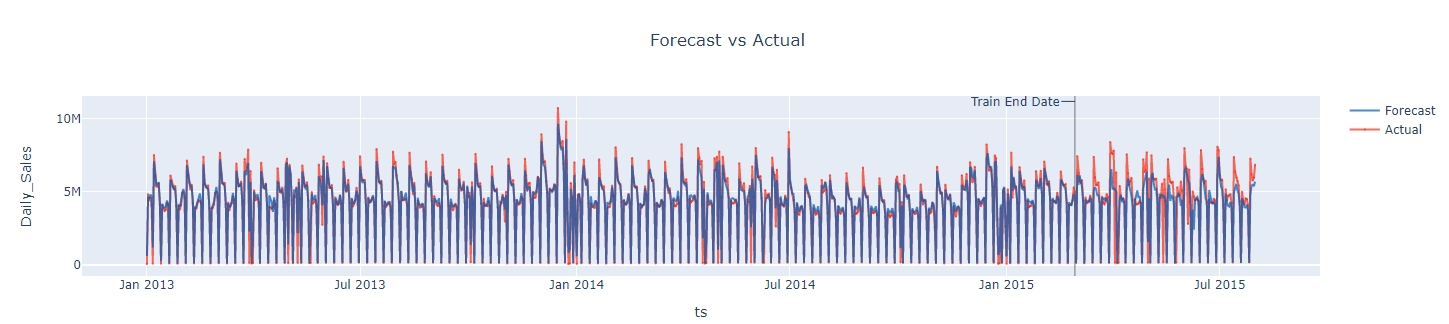 The code of applying grid search with cross validation, backtest and forecast are the same as Silverkite template. We can look at the output directly here.