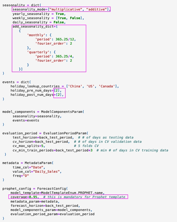 seasonality_modeis a unique parameter in Prophet template. It supports "additive" or "multiplilicative" modes. Mode "additive" is used when you assume the seasonality is constant over the time, and Prophet will add seasonality to trend in the formula. Mode "multiplicative" is used when you assume the seasonality is time varying, and Prophet will multiply the seasonality with the trend.add_seasonality_dictis also Prophet unique. You can define different cycles for seasonality such as "monthly", "quarterly", etc. In each cycle, you can define the period and fourier order. Fourier allows faster fitting in changing seasonality cycles, but could also lead to overfitting. N Fourier terms corresponds to 2N variables used for modeling the cycle.In