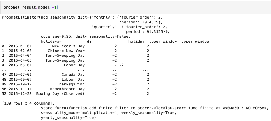 Although using Prophet template, we got better model performance in both MAPE and R2, its model summary is a shame. Look, this is all you can get: