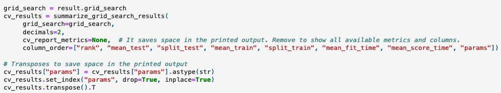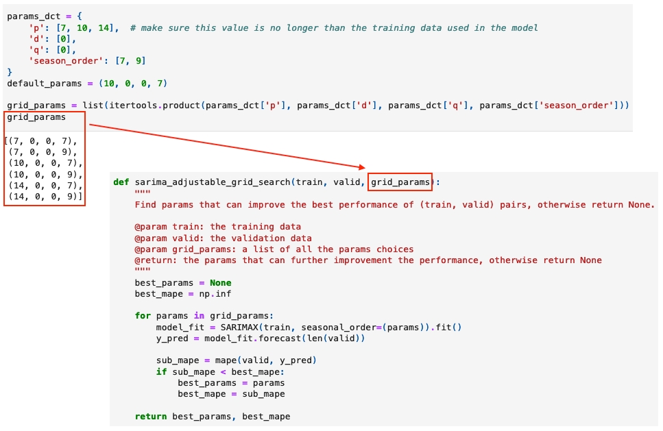 The grid search code is shown below. It iterates through each parameter set and selects the one that achieves the best validation performance, using MAPE as the performance metric. The results align with the findings in Step 2, where p=7 appears to deliver better model performance than p=10.