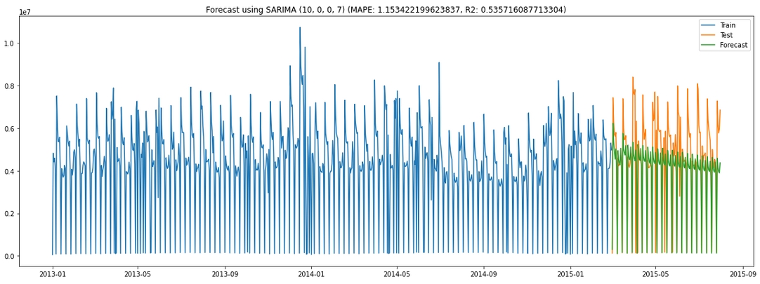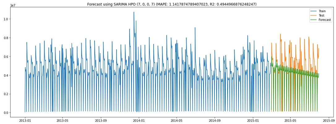 (p=7, d=0, q=0, m=7)is the selected parameter set. The optimized model gets better MAPE but worse R2: