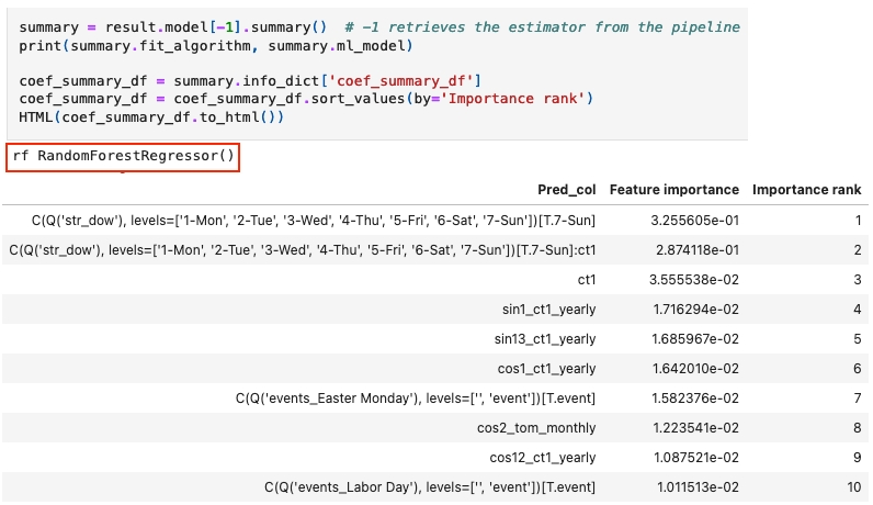 Besides the prediction results, Gryekite also provides a model summary. As the generated features play a core part in Greykite forecasting, the model summary mainly shows the feature contributions to the model. For example, here's part of the model summary from the experiment above. It's showing random forest is the selected model, also outputs the features used in the model as well as their feature importance: