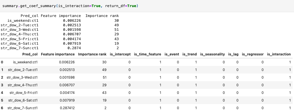 C(Q('str_dow'), levels=['1-Mon', '2-Tue', '3-Wed', '4-Thu', '5-Fri', '6-Sat', '7-Sun'])[T.7-Sun]is a type of seasonality feature, it's using day of week ("dow") as the feature.ct1is a linear growth feature, it counts how long has passed since the first day of training data (in terms of years). To learn more details, check "Growth" here.Features start with "sin" and "cos" are fourier features, these features treat the time series as a wave, trying to capture the amplitude and frequency from it.