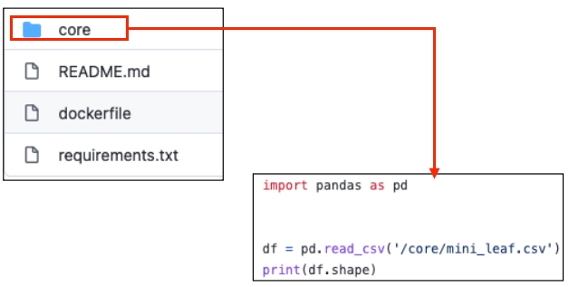 All the code in folder "core" will be copied to docker, under path "/usr/src/moss_example/core/". Suggest to have the source and destination folders share the same name in this copy command, so that your code can run both locally and run in docker.
