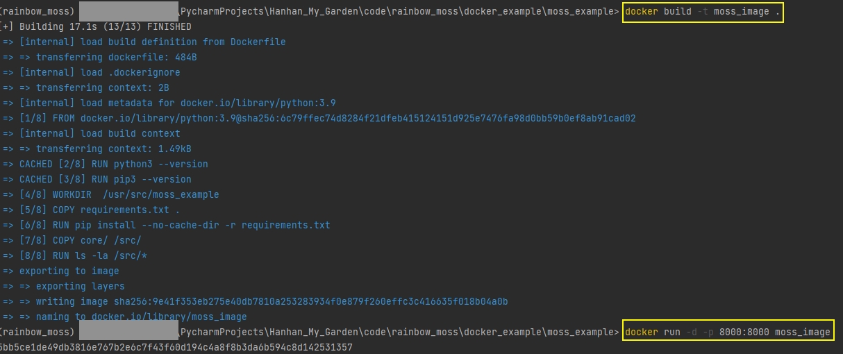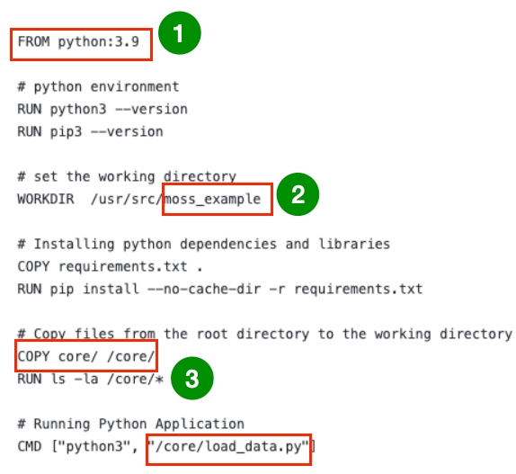 WORKDIRindicates the project folder in the docker container, "/usr/src/" is often the root path, and "moss_example" will be the folder of this project in docker.