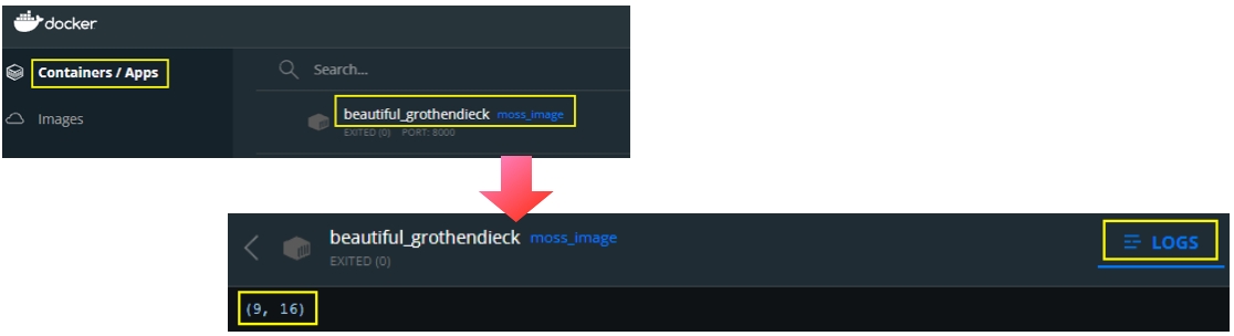 To check Moss Example's output, you can open the Docker Desktop, click on the container that contains your image and check its log. If the execution failed, you can also find errors in this log.