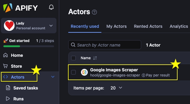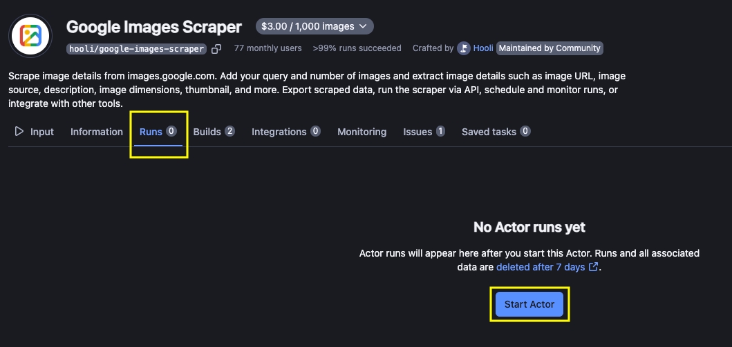 Click Google Images Scraper, then click Runs, followed by clicking Start Actor.