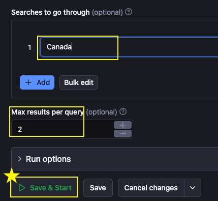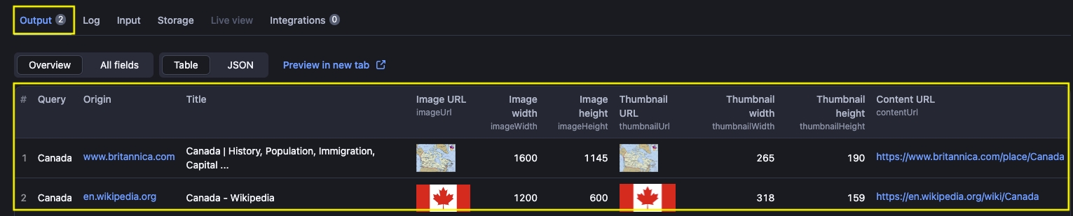 Next, you will see a page where you mainly need to click Save & Start to start the actor. Before clicking this button, you can also specify the image search query and maximum number of returned results. In this example, Lady H. was searching for 2 images of "Canada".
