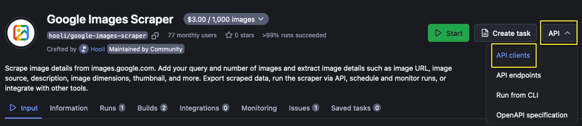 Apify even prepared the while piece of code for you to copy in order to use this scraper. Go back to Google Images Scraper and click API in the top right corner. Then click API clients from the dropdown menu.