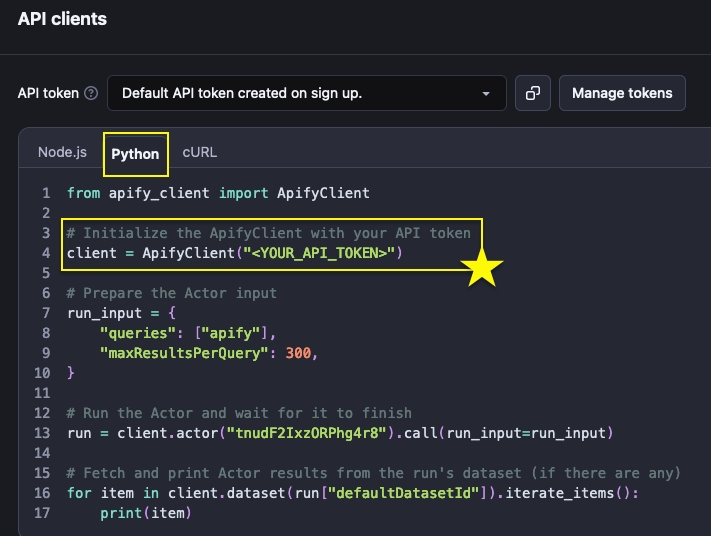 The code template is written in different languages, choose Python and copy the code there. To execute this scraper, you only need to replace "<YOUR_API_TOKEN>" with your own API token.