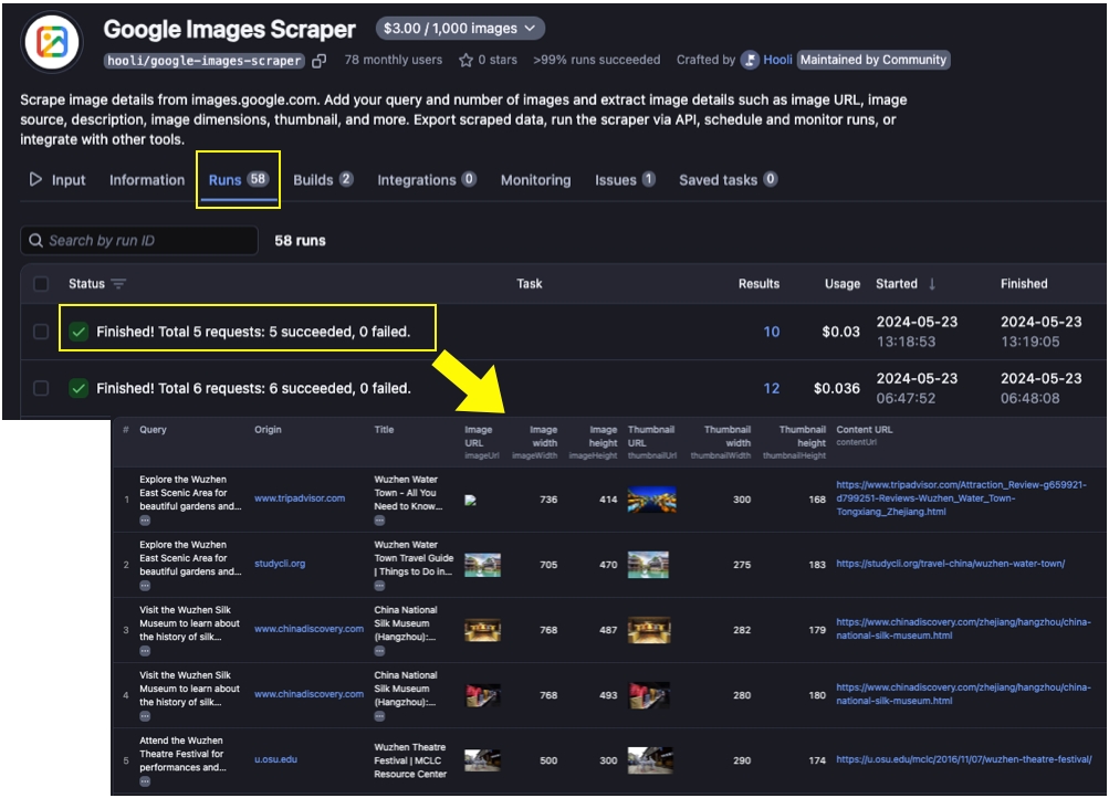 Another benefit of using Apify is its logs of every run, which allow you to check execution times, image search results, and more. This can help you better understand the user experience and make further improvements.