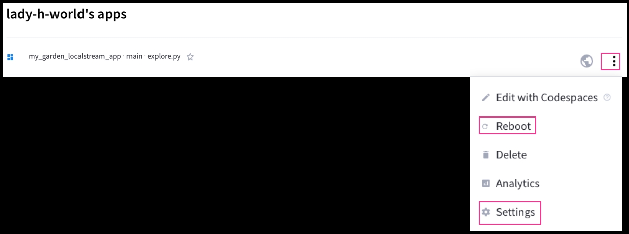 Sometimes, you may need to update your app's settings, such as secrets. To do this, in your Streamlit account, click the 3 dots of your app, followed by clicking Settings and make changes. If the changes don't take effect immediately, click Reboot to ensure they are applied right away.