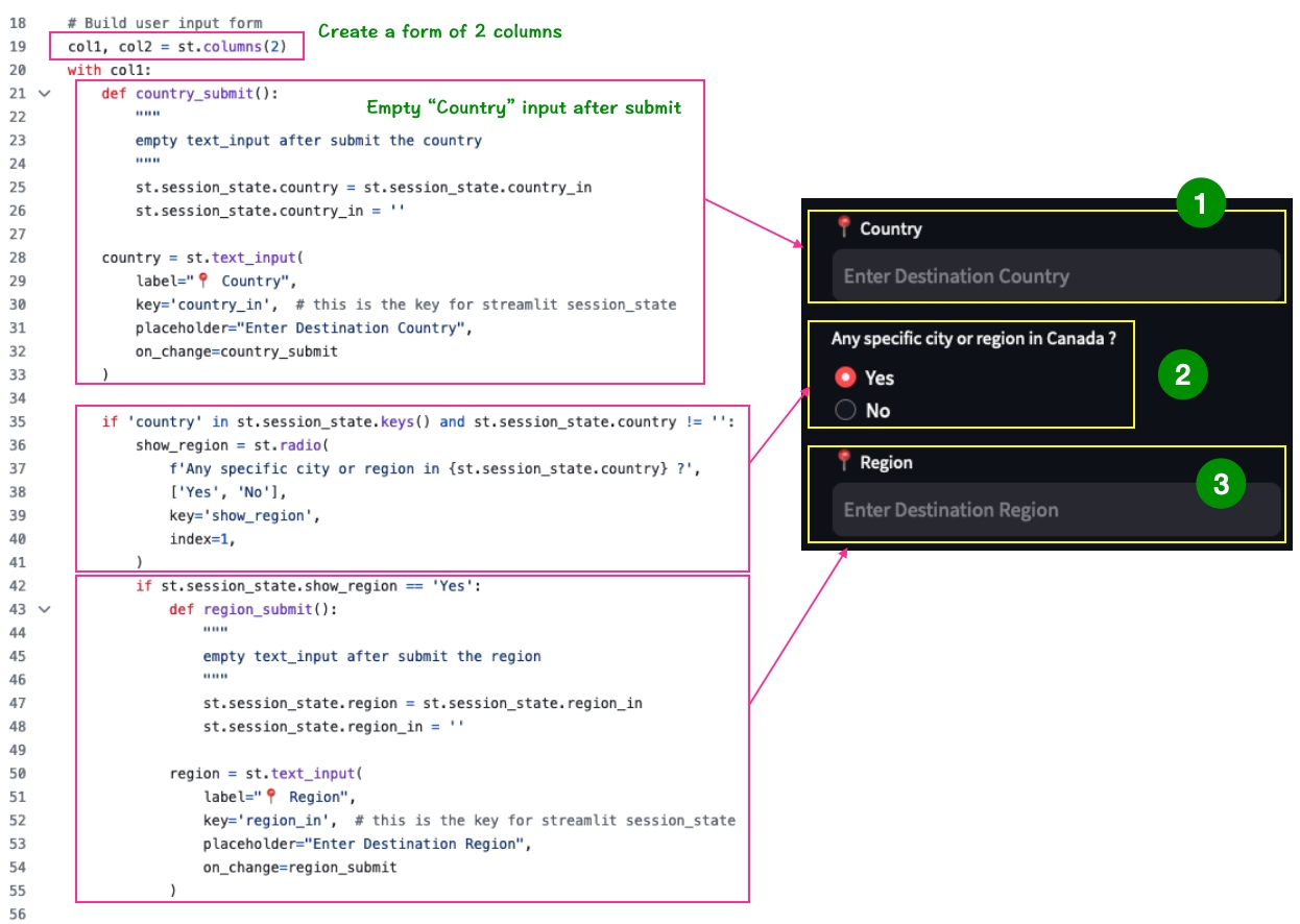 text_inputis created to submit "Country" value, once the value is submitted, this text input will be cleared. Streamlit provides multiple ways for users to submit the value: they can press 'Enter', 'Tab', or simply move the mouse out of the input field.After the user filled in the country value, a