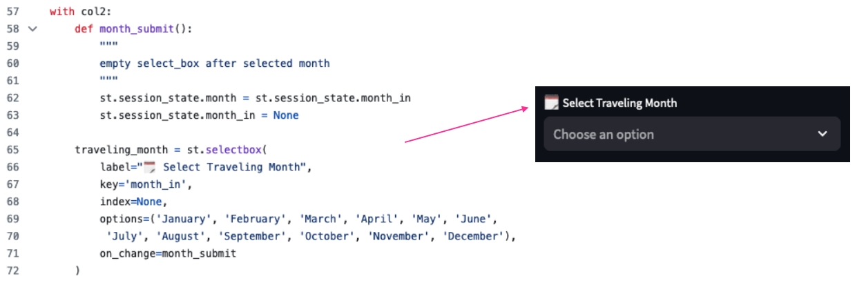 And in the second column col2, a selectbox is created to allow the user to choose the traveling month.
