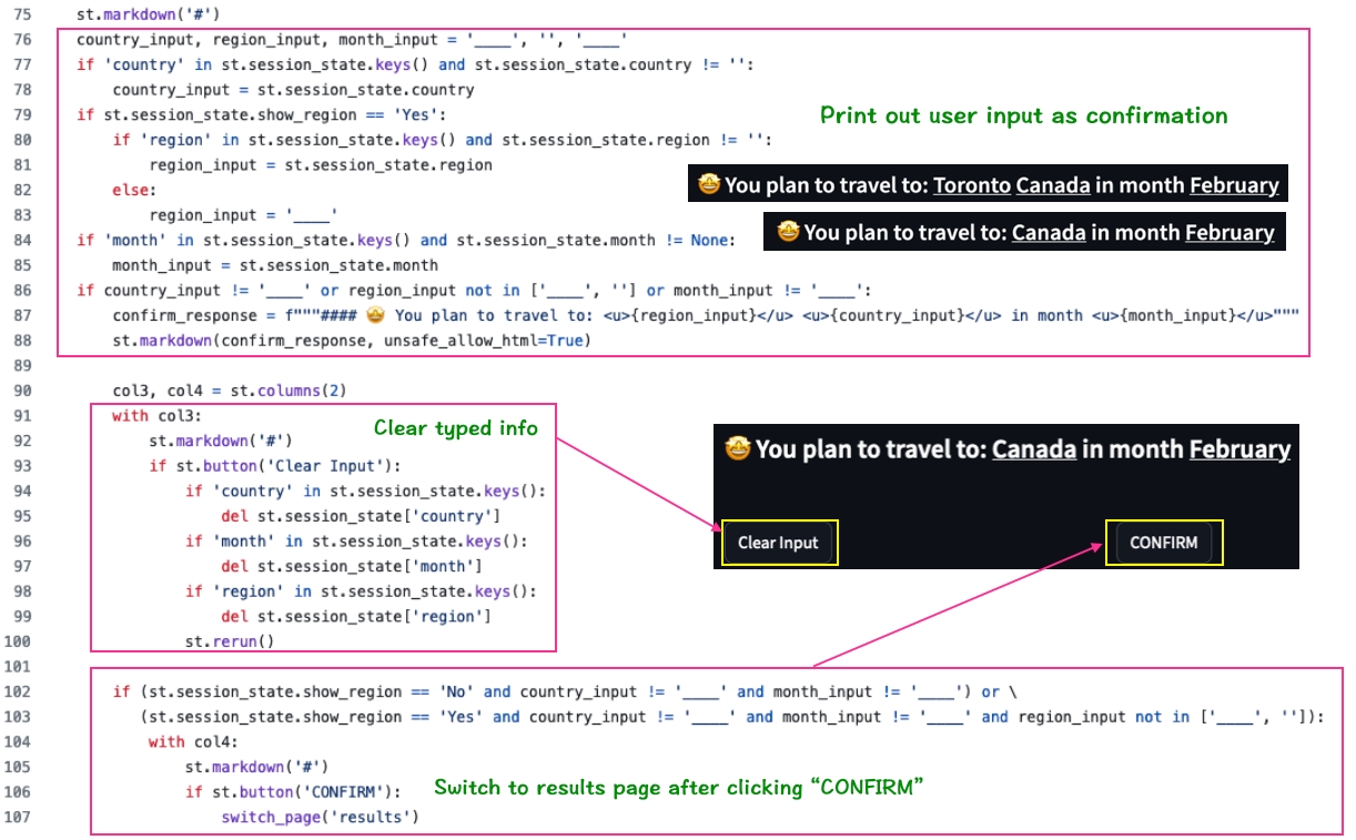 Line 76 ~ 88 will display the user's input, including country, region and selected month.