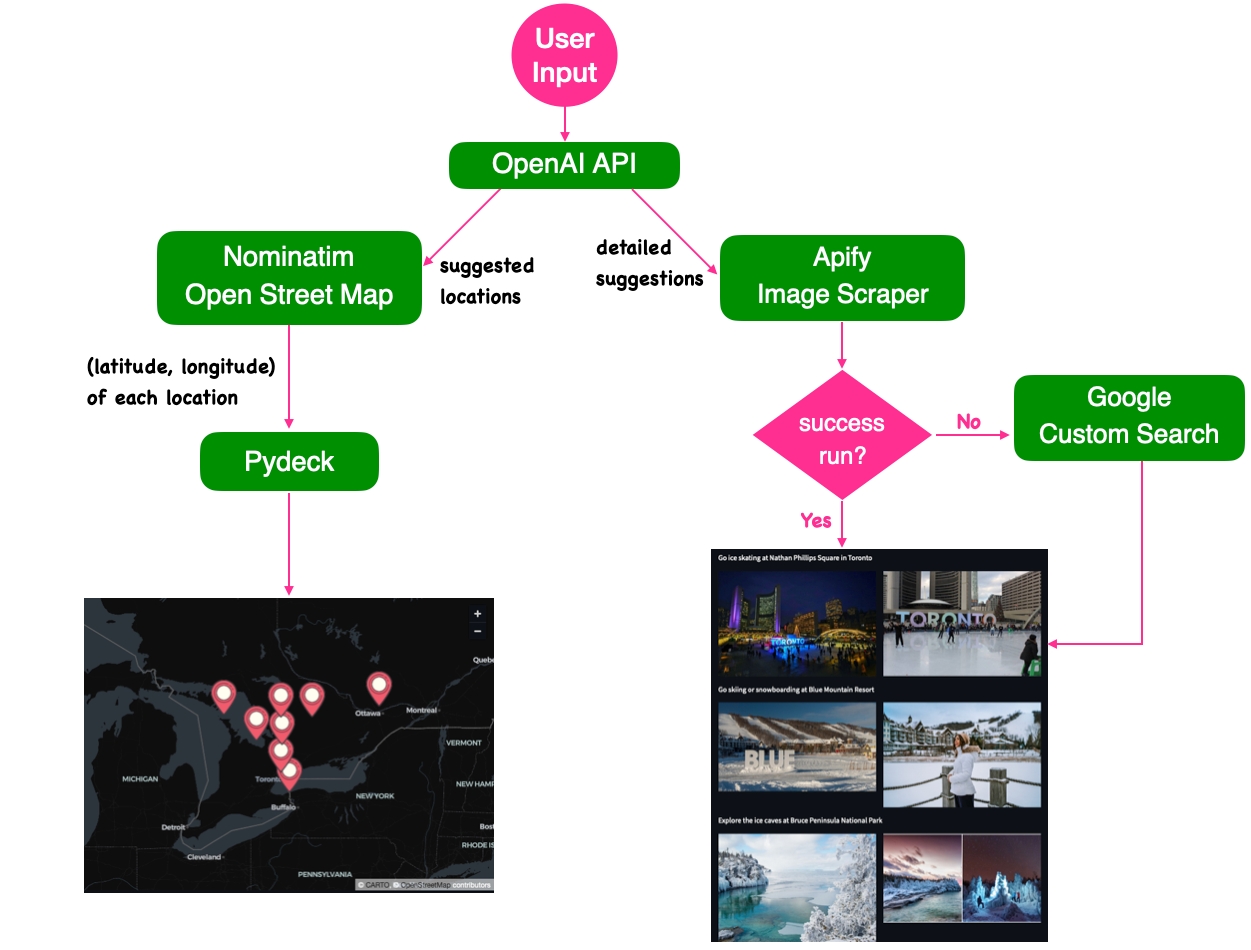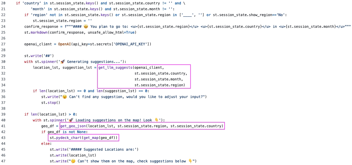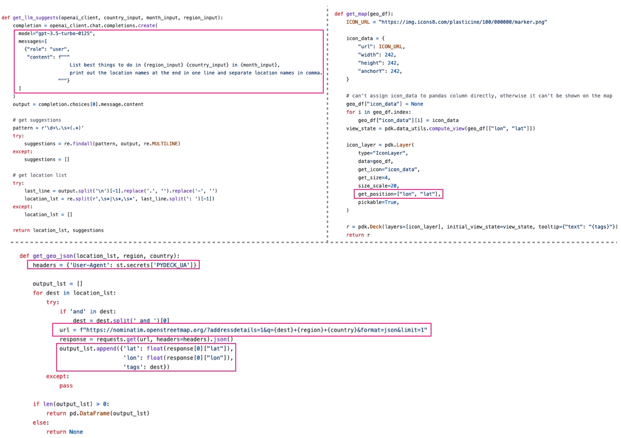 get_llm_suggests()uses OpenAI to suggest traveling locations in your destination and local activities in each location.get_geo_json()uses Nominatim, a geocoding software to find the latitude and longitude of each suggested location.get_map()will create a map based on locations' latitude and longitude, then Streamlit's built-inpydeck_chart()will display the map.