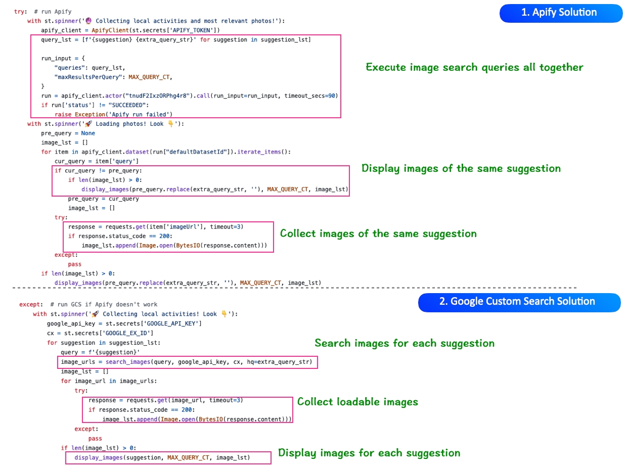 As shown in the code below, the main difference between these two approaches is that Apify executes all the image search queries before loading any images, while Google Custom Search executes a query and loads its images before moving on to the next query. Since Apify's image search is slower, executing all the queries upfront can reduce the total image search and loading time by half.