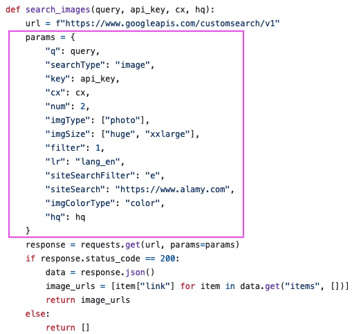 The search_images() implemented in utils.py shows all the filters Lady H. used for Google Custom Search.