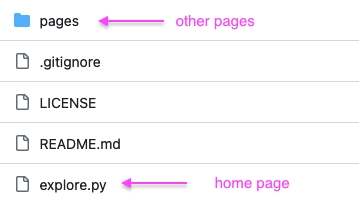 Create a .py file as the app's home page, such as the "explore.py" shown below.